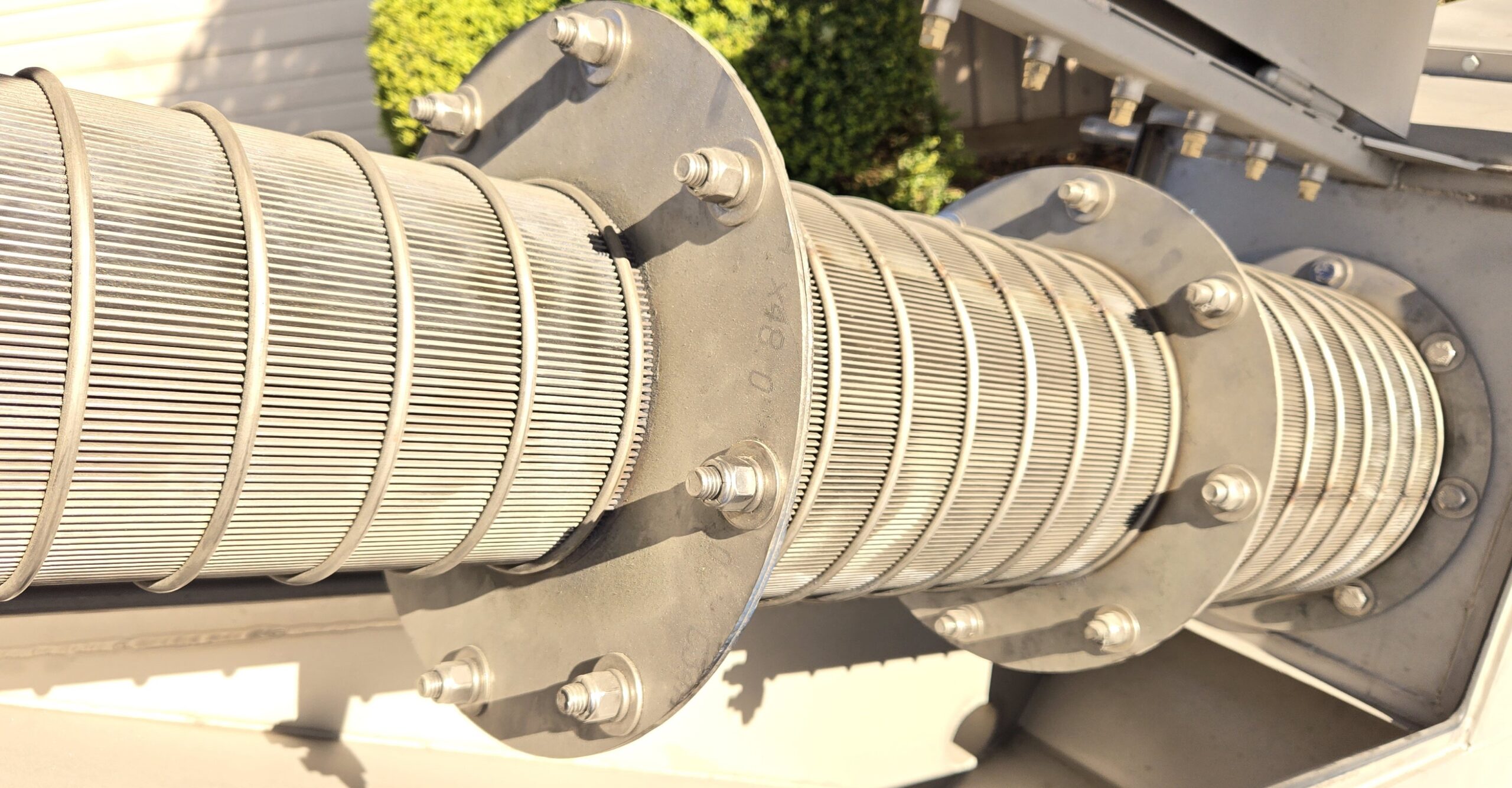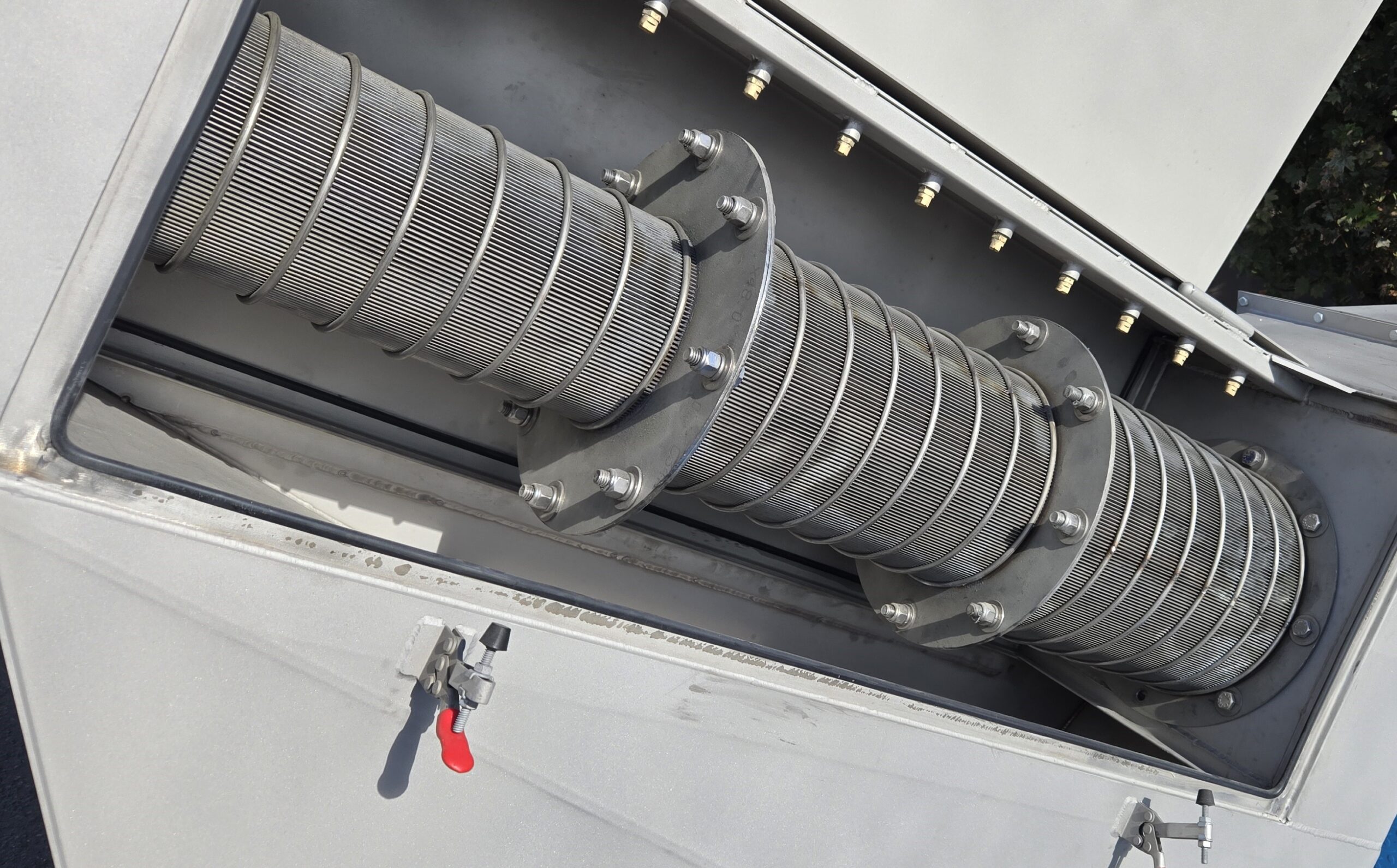 The PEWE DeWater® TSP triple screw press receives influent through the flanged inlet hopper and the incoming stream is accepted into the drainage section where free liquid is allowed to pass through a drainage fitting and removed for further processing. Solids are then conveyed by the auger screw through the transport tube and press section. The solids may be washed in the press zone. The solids are then gently compacted in the press zone.